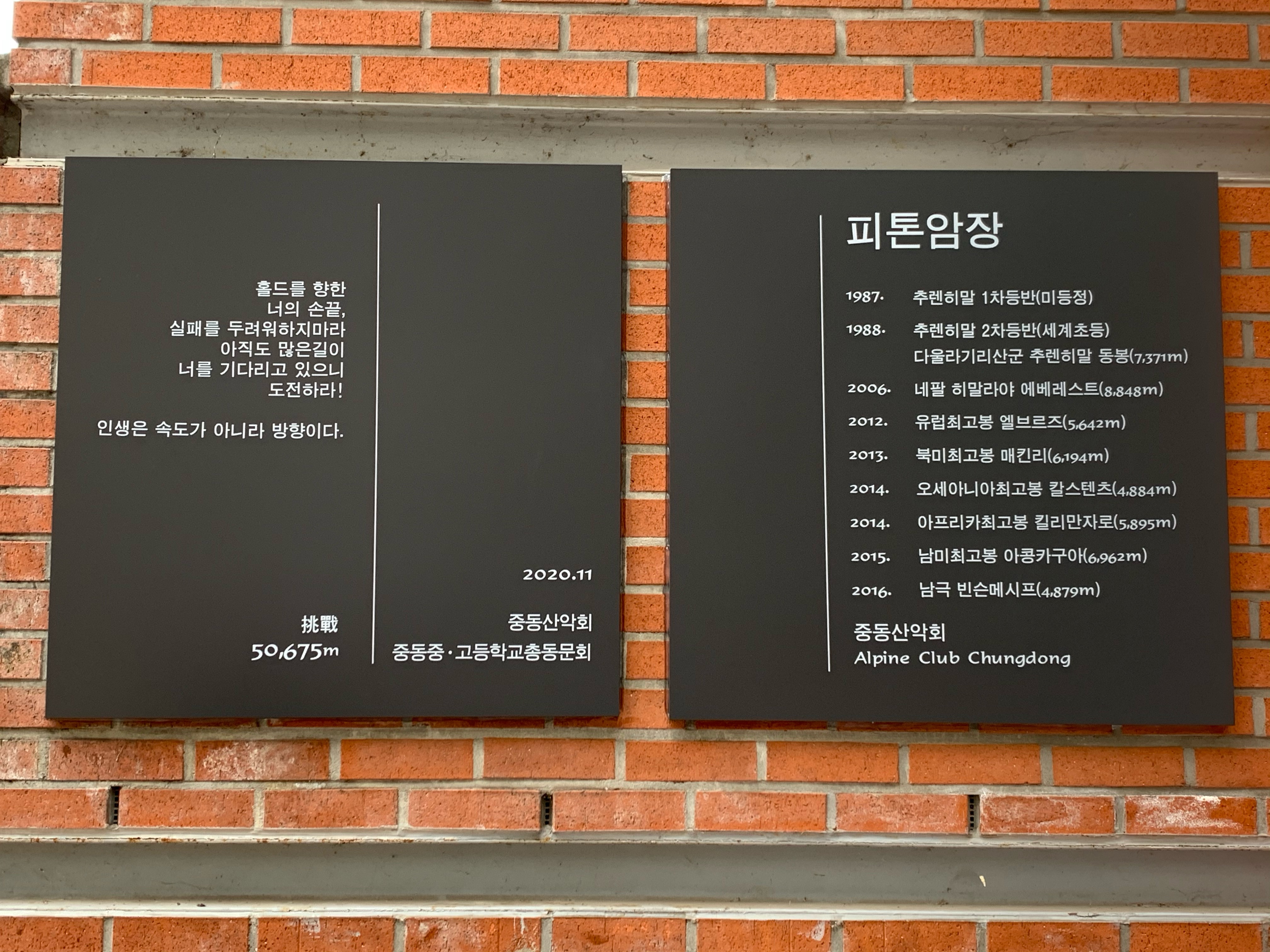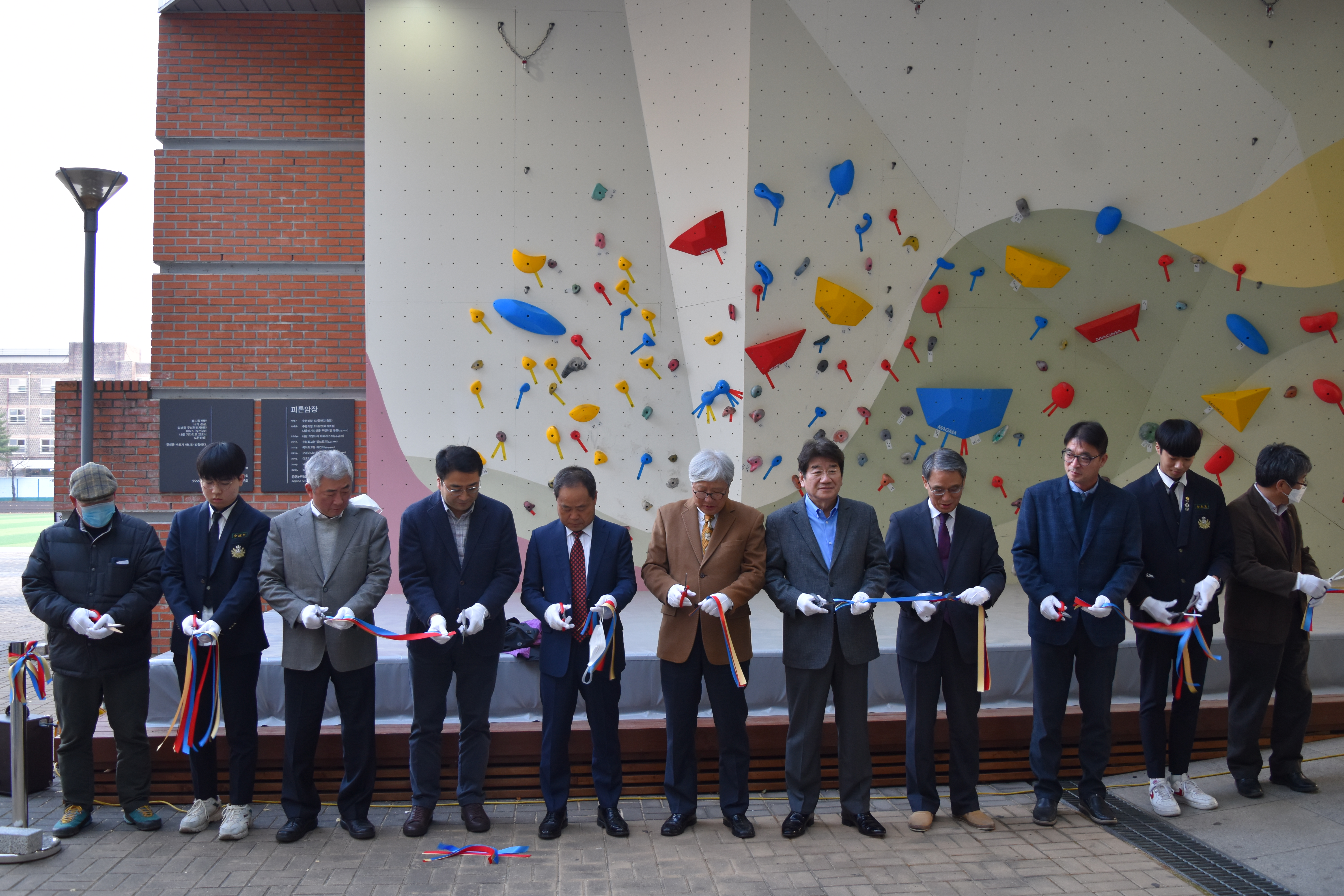 2020년 11월 13일 오후 4시 30분 본교에서는 백주년 기념관 벽에 설치된 인공암벽 ‘피톤암장’의 오픈식이 열렸다. 중동인의 안전과 건강, 도전과 극기를 기원한다는 의미로 명명된 ‘피톤암장’은 중동 산악회에서 기금을 조성해 본교 교직원 및 학생들의 클라이밍 활동을 도모하기 위한 목적으로 설치된 인공암벽이다. 60여 년의 유구한 전통을 이어온 중동 산악회는 백두대간은 물론 에베레스트 원정, 세계 7대륙 최고봉을 완등한 역사를 지닌 산악회로서 언제나 중동 동문들의 자랑이 되어 왔다. 이번에 중동 산악회에서 모교에 기증한 피톤암장은 암벽인 벽체에 홀드가 세팅되어 있고, 아래쪽에는 데크를 설치해 학생들의 즐겁고 행복한 클라이밍이 되도록 구성되어 있다.