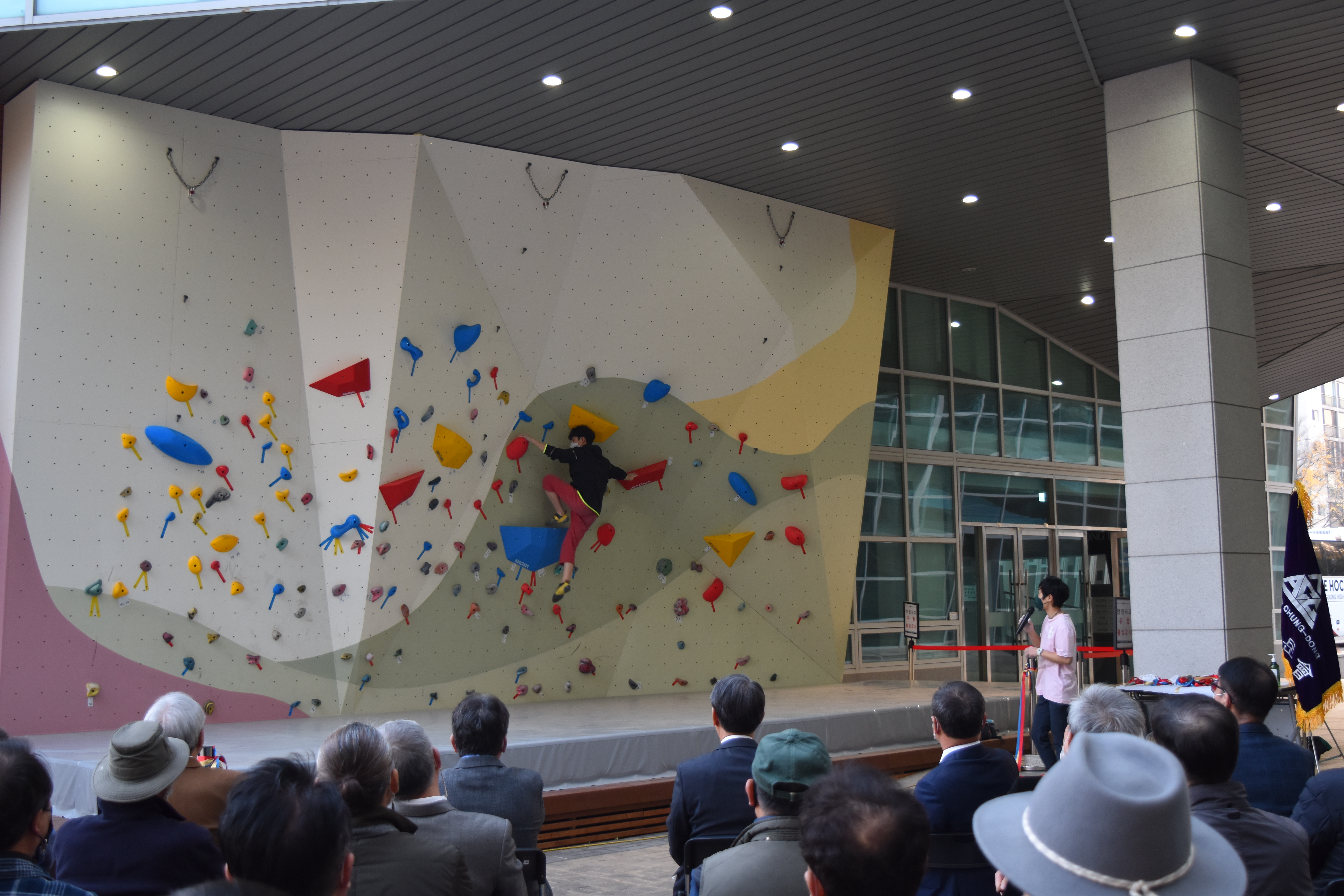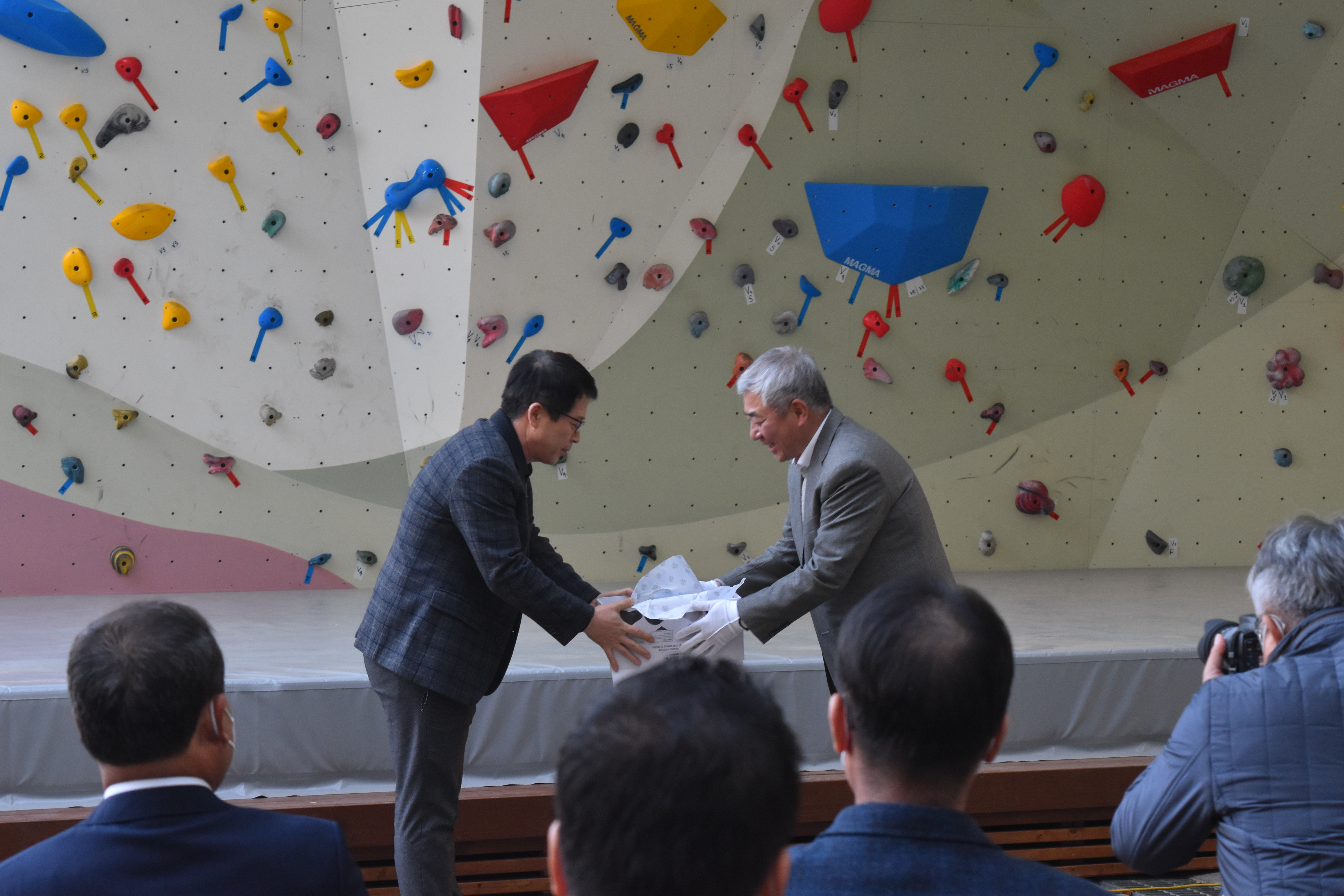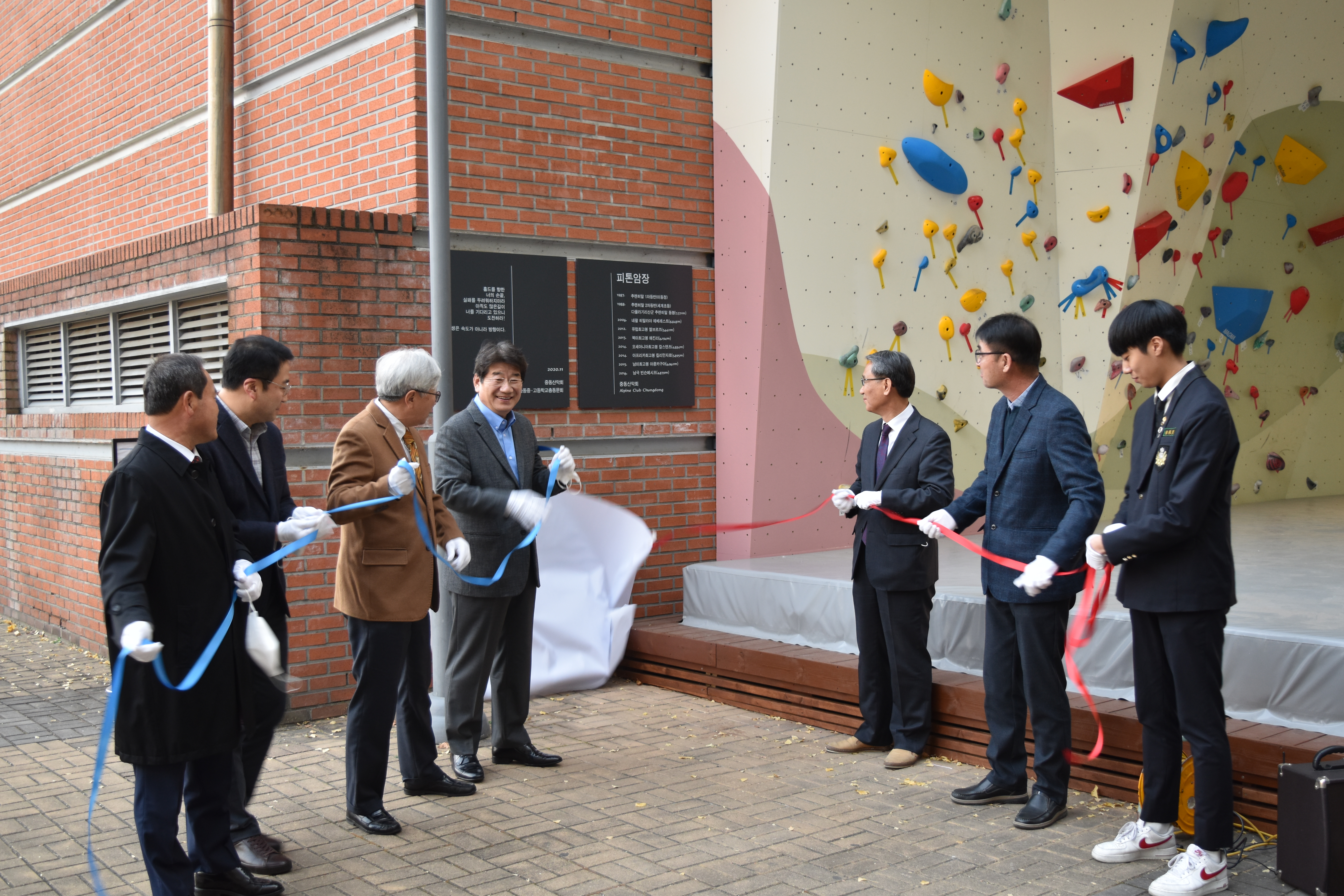 축사와 격려사 뒤에는 중동 산악회 동문들이 암벽화, 자일 등 클라이밍 물품을 모교 산악반 담당 교사에게 전달하는 행사가 이어져 분위기를 더욱 돋우었다. 이후 피톤암장의 기증 취지를 담은 현판에 대한 제막식과 피톤암장 개관 커팅식이 모두의 열렬한 박수 속에 진행되어 한껏 분위기가 고조되었다. 이어 인공암벽 시범 순서가 이어졌는데 특히 클라이밍 국가대표를 지낸 김인경 선수 및 본교 102회 졸업생이며 산악회 총무인 최순영 동문이 화려하고 탁월한 기량으로 시범을 보여 참석자들의 탄성을 자아냈다. 이렇게 피톤암장은 후배 중동인의 건강과 체력, 도전과 극기를 위한 중동 산악회의 모교 사랑, 후배 사랑으로 기억되어 중동의 또 하나의 뜨거운 자랑거리가 될 것이다.